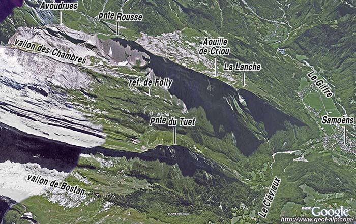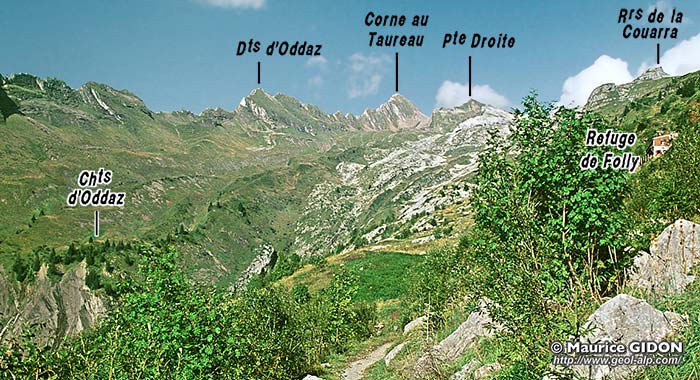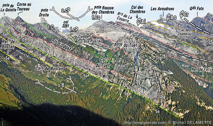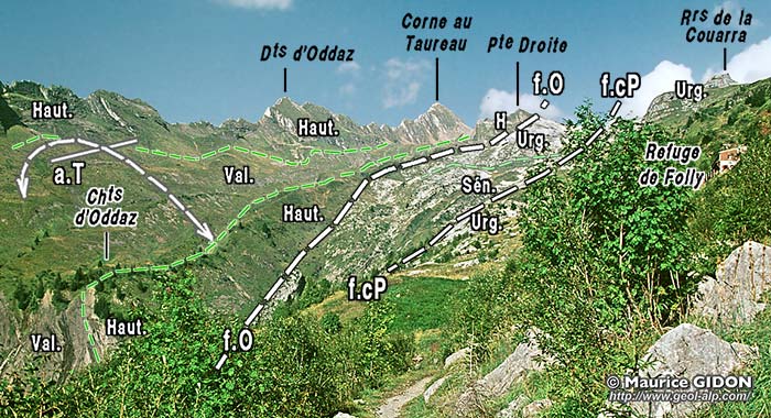 ![]() Le vallon d'Oddaz, vu d'aval, depuis les abords du refuge de Folly a.T = anticlinal du Tuet ; f.O = faille d'Oddaz ; f.cP = faille de la Combe aux Puaires. |