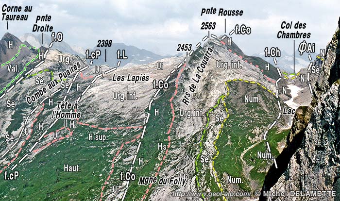 Au sud de cet anticlinal du Tuet on entre dans le synclinal de la Combe aux Puaires, très large et très ouvert, qui est en outre rompu par un système de failles extensives parallèles à son axe. La principale est la faille de la Combe aux Puaires, dont le tracé suit presque l'axe du pli. Au contraire de celle d'Oddaz elle surhausse sa lèvre méridionale, portant ainsi à l'érosion une longue bande presque E-W de dalles structurales urgoniennes. Celles-ci, peu inclinées et érodées en lapiaz s'élèvent régulièrement vers l'est depuis le refuge de Folly jusqu'au sommet de la Pointe Rousse des Chambres.