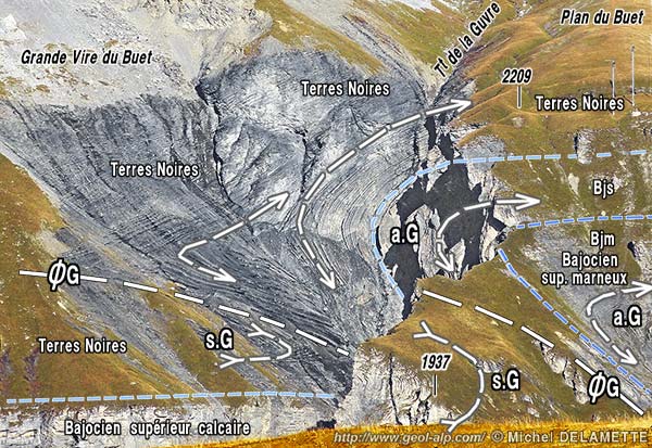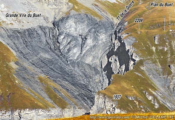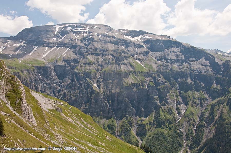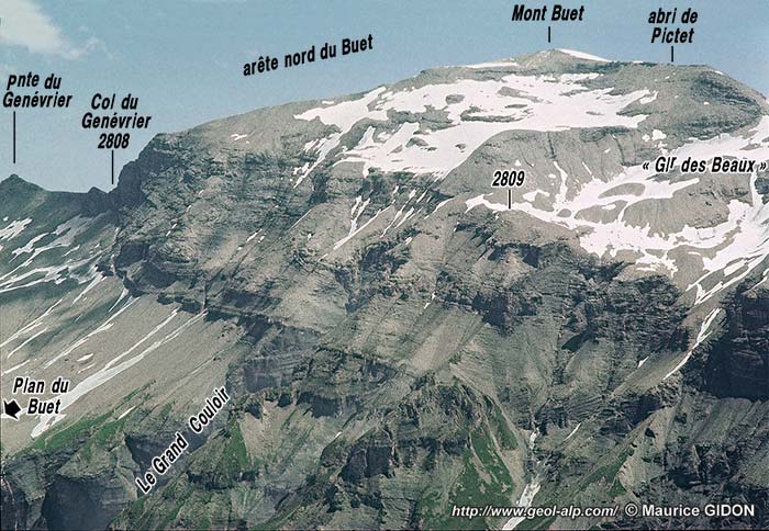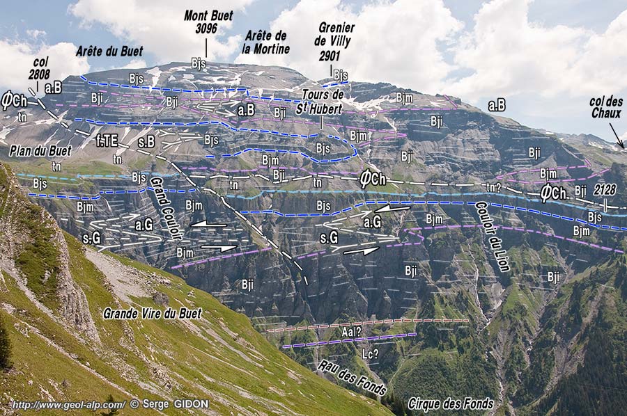 Les hauts abrupts de la façade orientale du cirque, limités par le Grand Couloir, au sud du Plan du Buet montrent une superposition de falaises et de talus apparemment parallèles : la raison en est que ce versant est orienté presque selon l'axe des replis qui y affectent la pile des couches (il ne montre donc aucune coupe transversale de charnière).