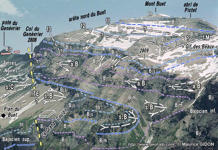 ![]() Le versant occidental du chapeau sommital du Buet vus du sud-ouest, depuis la Pointe de Sales (analyse plus détaillée selon un angle moins orthogonal à l'axe des plis). s.C = synclinal de Commune ; s.B = synclinal du Buet ; a.B = anticlinal du Buet. f.TE = faille de Tré les Eaux ; f.M = faille de La Mortine ; f1, f2= failles chevauchantes mineures ; f3 = faille extensive synsédimentaire ?. Le Bajocien supérieur du flanc inverse commun au synclinal et à l'anticlinal du Buet subit un étirement allant presque jusqu'à la rupture en chevauchement. Vers le sud (droite du cliché) le cœur du synclinal disparaît, enlevé par l'érosion, du fait que son axe est oblique au versant : il "rentre" dans celui-ci pour réapparaître dans les escarpements orientaux de l'arête nord du Buet (voir ce versant à la page "Buet"). Trois petits schémas montrent l'attitude de la stratification : toutes les couches (même celles du flanc supérieur de l'anticlinal couché) pendent faiblement vers l'ouest, ceci du fait que l'on est déjà là dans le flanc ouest de la grande ondulation anticlinale des Platières). |