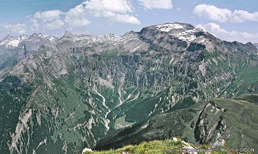 Quant au chevauchement d'Anterne il se poursuit nécessairement en traversant ce torrent de Sales plus en amont. Au delà vers le nord le versant de rive gauche de la vallée du Giffre des Fonds est trop garni d'éboulis pour que l'on puisse savoir s'il s'y prolonge ou s'il s'y amortit au sein des niveaux riches en marnes du Crétacé inférieur (voir la page "Sixt"). |