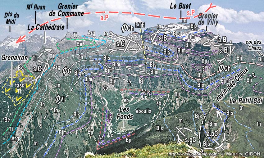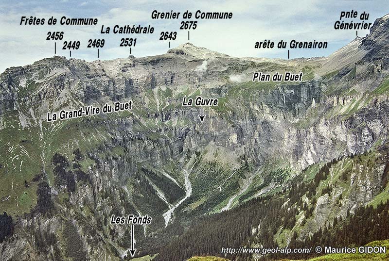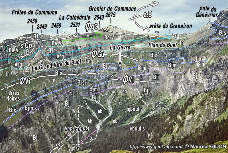 Cette attitude "paradoxale" des plis est particulièrement illustrée, du côté nord-ouest du cirque, par la crête annexe Grenairon - Grenier de Commune, qui constitue le contrefort occidental de la montagne et dont le versant NW tombe sur la vallée du Giffre. Elle est sculptée dans les terrains plus élevés de la série stratigraphique, c'est-à-dire le Jurassique supérieur et le Crétacé inférieur, qui enveloppaient la crête du Buet mais que l'érosion a supprimés sur cette crête jusqu'au vallon d'Anterne inclus (voir la page "Anterne").