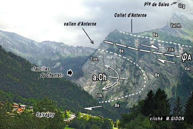 Ce pendage vers le NW des plans axiaux est en fait celui de la surface de la pénéplaine anté-triasique du flanc occidental du bombement de socle cristallin du massif des Aiguilles Rouges et il résulte donc clairement de la formation de ce dernier, qui a basculé vers le NW des plis formés antérieurement. En fait on retrouve là un schéma d'évolution tectonique qui est général à tous les confins entre massifs cristallins externes et chaînes subalpines dans les Alpes françaises septentrionales). |