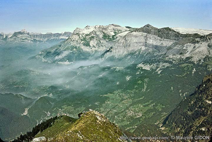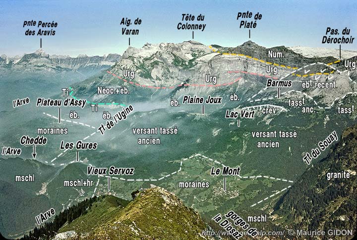 ![]() Le versant méridional de l'extrémité sud-occidentale du massif de Platé, vu du sud depuis le sommet du Mont Joly. f.Br = faille de Barmerousse ; s.P = synclinal de Platé (d'axe NE-SW, oblique au regard et aux falaises du versant). Noter l'abondance des paquets tassés (semis de v) et des cônes de matériel éboulé (ébt = éboulements) (suite vers la droite à la page "Platé"). |