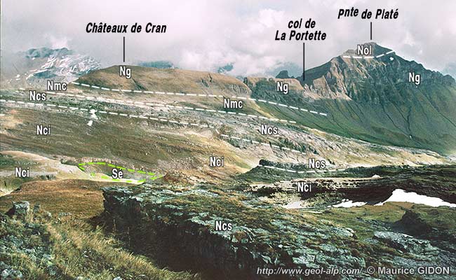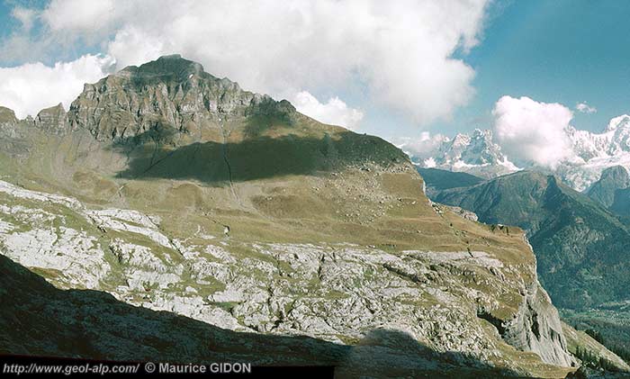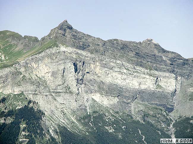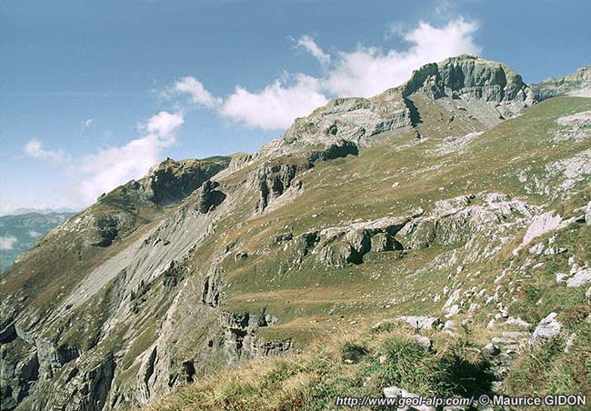 Dans tout ce versant le pendage général des couches est dirigé vers l'aval et celles-ci ont donc tendance, sous l'effet de leur poids, à glisser vers la vallée en se détachant à la faveur des diaclases orthogonales à la pente (et surtout de celles éventuellement ouvertes par l'érosion karstique) : le versant se débite donc en tranches successives qui se disloquent plus ou moins selon les cas : c'est un paquet tassé peu disloqué qui constitue les pitons rocheux cotés 1805 qui dominent (et menacent) le sentier d'accès aux chalets de Platé (cliché ci-dessus) ; on en trouve d'autres à plusieurs niveaux sur le versant ouest du vallon.