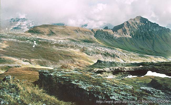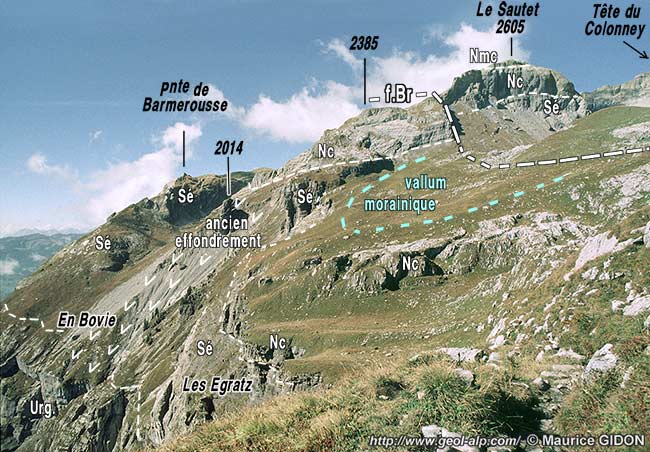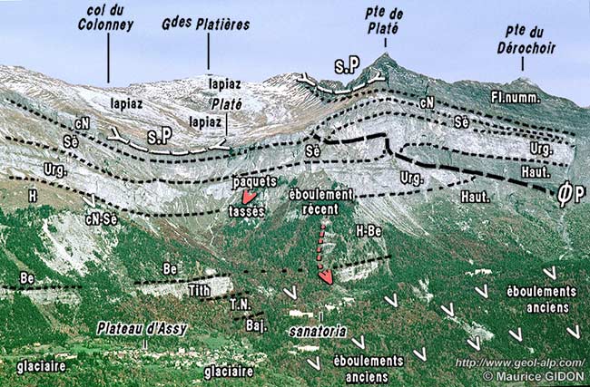 Ces pentes sont en particulier traversées par un alignement supérieur de replats qui s'élèvent vers le NE, au pied des raides pentes d'éboulis du pied des falaises, depuis le Plateau d'Assy et la Plaine Joux jusqu'à l'épaule de Barmus. Cet alignement marque la limite supérieure de la masse glissée ; or la crevasse qui le domine semble en fait calquer son tracé sur celui, masqué, du pied de la barre tithonique (laquelle réapparaît, peu au delà de son extrémité nord-orientale, dans le ravin d'Allières). |