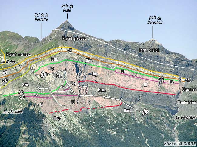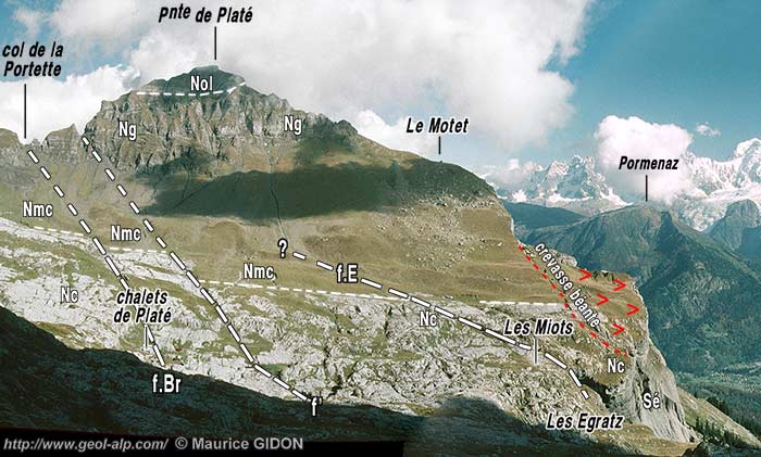 Les modalités de l'amortissement du "chevauchement" de la Pointe de Platé peuvent être analysées par un simple examen attentif de la coupe naturelle de la falaise : le rejet s'y annule progressivement par le basculement d'un panneau d'Urgonien et, à l'avant de celui-ci (jouant comme une lame de bulldozer), par des froissements des couches du Sénonien ; le déplacement horizontal ainsi absorbé (et compensé par un accroissement d'épaisseur équivalent) peut être évalué en additionnant les longueurs des panneaux d'Urgonien ainsi bousculés (puisqu'ils étaient originellement bout à bout) : il semble à peine inférieur à un millier de mètres. La surface de contact tectonique entre les deux lèvres a un tracé complexe qui comporte des tronçons sub-verticaux qui ne peuvent résulter d'un cisaillement horizontal. Cela indique que, en dépit de la longueur des tronçons qui correspondent à des surfaces de couches, ce dessin de la cassure doit en fait résulter de la déformation une faille verticale extensive (à lèvre orientale surélevée) par des efforts cisaillants ayant provoqué des glissements couches sur couches (ces glissements étant parallèles à la surface de base du Nummulitique n'ont pas entraîné de déformation de cette dernière). |