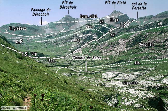 ![]() Le versant occidental de la crête des Rochers des Fiz (partie nord), vu de l'ouest, depuis les Grandes Platières (cliché et détails d'interprétation par M. Michel Delamette). s.P = synclinal de Platé : son axe pend légèrement vers la droite (vers le sud-ouest) ; f.S = faille de Sales : on a indiqué les plissotis (dans le Sénonien) et le crochon arrondi (dans l'Urgonien) qu'elle détermine sur ses lèvres. |