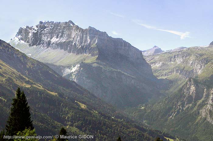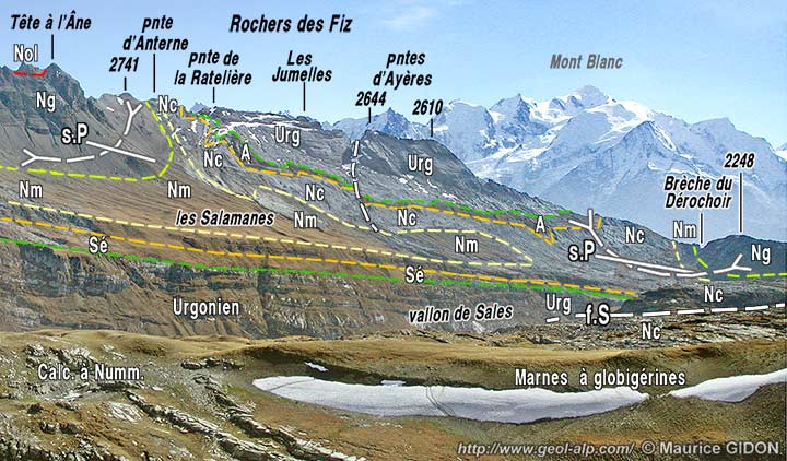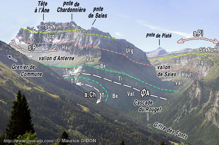![]() L'extrémité septentrionale du chaînon des Fiz, vue du NE depuis les pentes de Sans Bet (au NE de Sixt). ØA = chevauchement d'Anterne : cet accident concerne toute la succession stratigraphique du chaînon des Fiz et naît par décollement de la dalle tithonique qui affleure au fond du vallon d'Anterne ; a.Ch = anticlinal couché du Chantet. Plis sur-imposés, à grand rayon de courbure : s.P = synclinal de Platé ; a.Pl = anticlinal des Platières. |