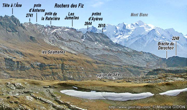 Vers le NE, la faille de Sales se poursuit jusqu'à la crête des Rochers des Fiz, qu'elle franchit 700 m au sud de la Pointe de Sales (d'ailleurs avec un rejet vertical assez différent : voir la page "Anterne").