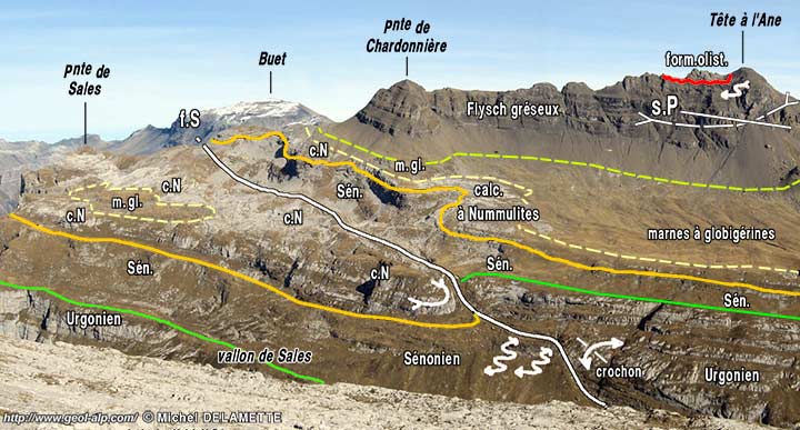 ![]() Le versant occidental de la crête des Rochers des Fiz (partie sud), vu de l'ouest, depuis le col de Monthieu (crête entre les grandes Platières et le Grand Colonney). s.P = synclinal de Platé : son axe pend doucement vers la droite (vers le sud-ouest) ; f.S = faille de Sales. (voir plus de détails des pentes de la pointe d'Anterne à la page "Fiz"). |