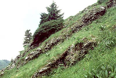 - Les éboulis de formation récente (édifiés depuis la glaciation de Würm jusqu'à nos jours) sont meubles et instables. Ils tapissent le pied des falaises, où ils se superposent le plus souvent à des éboulis anciens (qui descendent plus bas), et garnissent, de plus, les flancs et/ou le fond des ravins qui entaillent ces derniers.