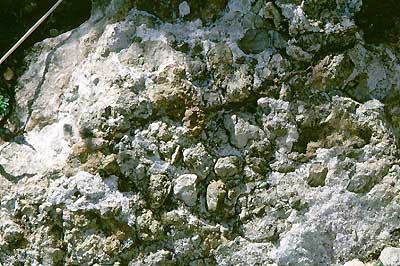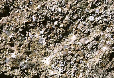 Fragment d'un affleurement de béton phosphaté (Grand Som) On y voit trois coquilles d'ammonites, chacune d'une taille voisine de 3cm., appartenant aux genres Hypacanthoplites et Leymeriella, de la base de l’Albien.