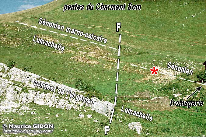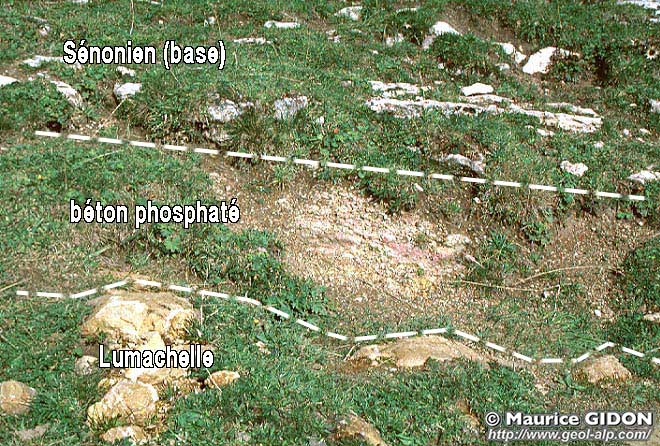 À leur base les marno-calcaires du Sénonien inférieur reposent en accordance (sans changement de pendage des couches) sur la Lumachelle. Ce contact correspond à une lacune (absence de dépôt) de l'Albien - Turonien.