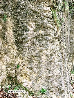 Face inférieure d'un banc calcaire des couches à Orbitolines. Rive gauche du Guiers Mort, dans les gorges de Fourvoirie. Le banc est redressé à la verticale (hauteur visible = 2 m) ; sa surface est mamelonnée par la contre-empreintes de traces en forme de sillons ramifiés, dues à des organismes fouisseurs. |