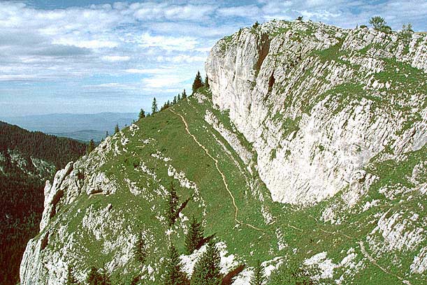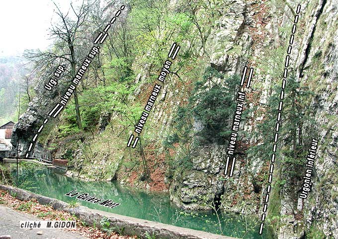 Les calcaires urgoniens se repèrent dans le paysage, entre autres critères, à ce que leur falaise ne présente que de rares vires (appelées ici "sangles"). La mieux marquée forme un talus d'une trentaine de mètres de haut, souvent garni de végétation. C'est la vire des "couches à orbitolines", qui marque la limite entre la "masse urgonienne inférieure", la plus épaisse (plus de 200 m., soit les 3/4 de la hauteur totale) et la "masse urgonienne supérieure", plus mince (50 à 100 m.).