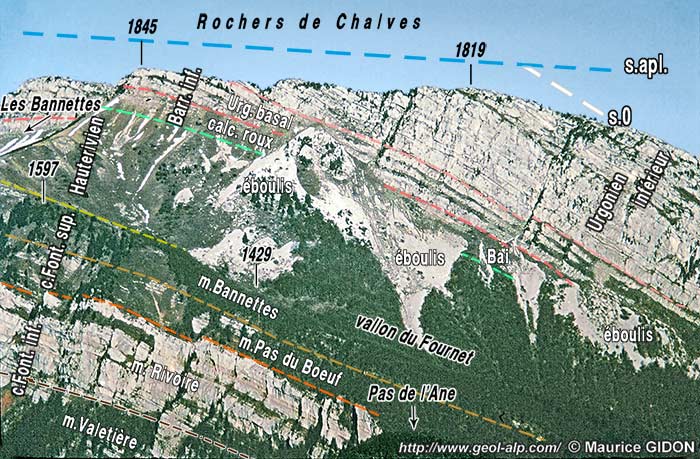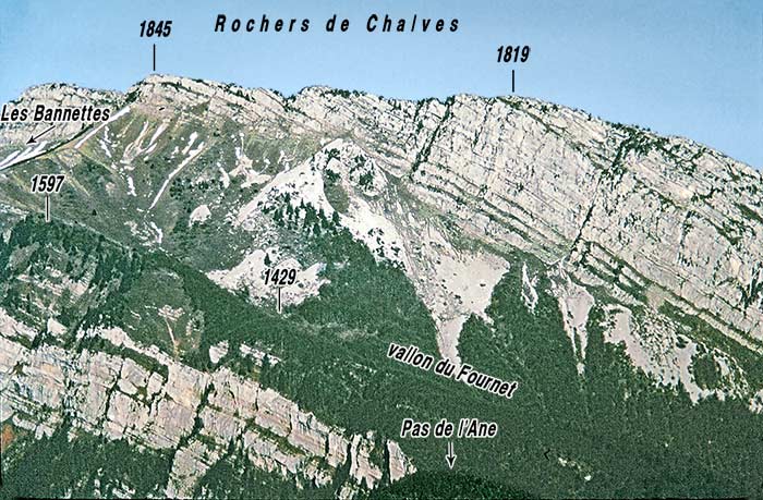 Sous cet angle on voit de profil sans déformation perspective, le talus hauterivien, épais de 180 m (mais où la roche est, comme souvent, en grande partie masquée par les éboulis).