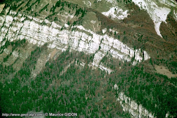 ![]() Les abrupts occidentaux des Rochers de Lorzier, vus du sud depuis le sommet de la Buffe (Vercors). Belle entaille de la succession des calcaires du Fontanil au sens large (elle est épaisse, car on est ici dans la Chartreuse occidentale). Elle permet de visualiser les subdivisions actuellement distinguées dans les terrains du Crétacé inférieur de ce secteur : La falaise la plus massive, qui forme l'arête faîtière, représente la partie basse de la formation des calcaires du Fontanil sensu stricto (membres de Valetière et de La Rivoire), qui appartiennent encore en majeure partie au Berriasien supérieur. La partie haute de cette formation n'est pas visible car elle affleure sur le revers opposé de la crète. Plus bas on entre dans la "formation du Chevalon". Les niveaux supérieurs de cette dernière, où des ressauts calcaires alternent avec des vires herbeuses (faisceaux de bancs plus riches en argile), constituent un terme de transition où se rencontrent déjà des bancs à faciès de calcaires du Fontanil. Ils appartiennent surtout au Berriasien moyen ("membre des Oullières", surmontant celui "du Peuil"). Les basses pentes, boisées ou garnies d'éboulis, correspondent aux alternances de marno-calcaires et de marnes du Berriasien moyen à inférieur ("membre de Sautaret"). patinées et colonisées par la végétation, où la roche paraît plus blanche. |