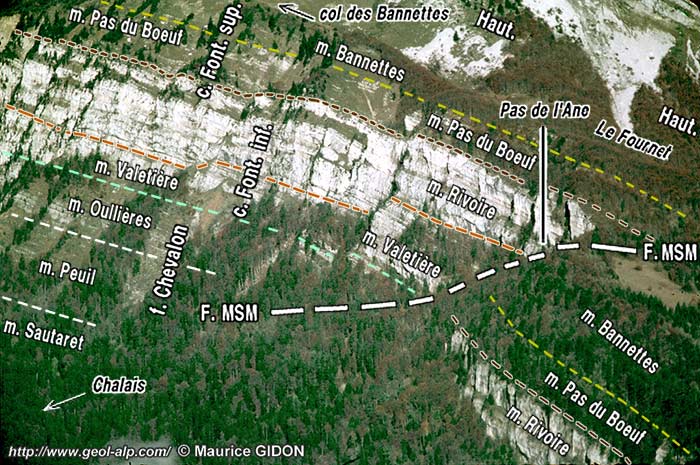![]() La succession des calcaires du Fontanil à la crête des Bannettes, vue du sud-ouest, depuis le tunnel du Mortier (Vercors nord). La crête elle-même, boisée ou herbeuse, est formée par les niveaux supérieurs des calcaires du Fontanil (dont la base correspond à la petite vire, bien marquée, du "membre de Mont-Saint-Martin"). La partie inférieure de la formation des calcaires du Fontanil forme la partie la plus massive de la falaise. Plus bas, seuls les bancs les plus calcaires de la "formation du Chevalon" forment de petits ressauts qui émergent du talus au pied de la falaise (pour la suite stratigraphique vers le haut voir le cliché de la page "Chalves"). Ces repères stratigraphiques sont décalés verticalement, au Pas de l'Âne, par la faille de Mont-Saint-Martin (F.MSM : pour plus de détails voir le cliché de la page "Chalais"). En arrière de la crête (angle supérieur droit du cliché), sur la rive opposée du vallon du Fournel (qui descend vers Mont-Saint-Martin), les éboulis qui tombent des falaises d'Urgonien des Rochers de Chalves ont presque totalement garni le talus de l'Hauterivien. |