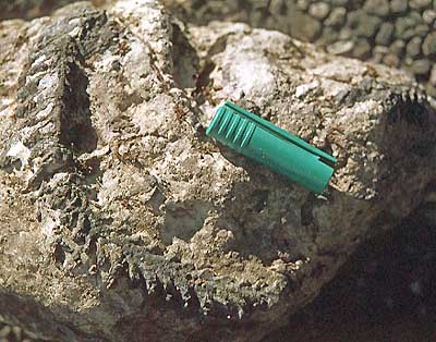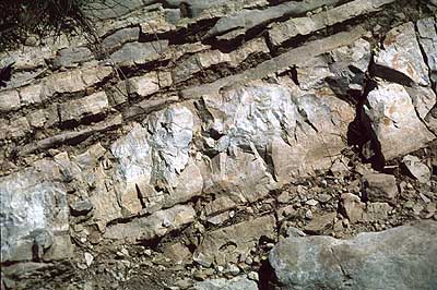 ![]() Vue rapprochée d'un affleurement de calcaires du Fontanil (route entre le Fontanil et Mont-Saint-Martin) La teinte rousse gagne depuis les zones diaclasées et la teinte bleue n'est conservée qu'à une distance minimale de 10 cm de la diaclase la plus proche. |