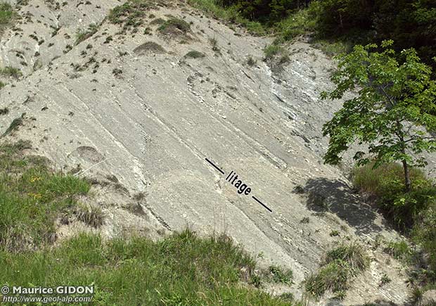 Le regard du photographe est orienté dans le plan de stratification ; on distingue le litage à la faveur de la présence de petits lits plus calcaires d'épaisseur décimétrique.