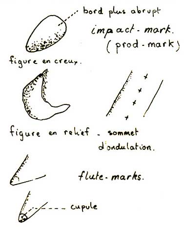 sédimentaires appartenant aux types rill, flute, groove, bounce marks : il s'agit d'indices de