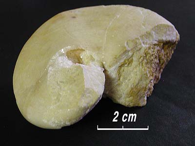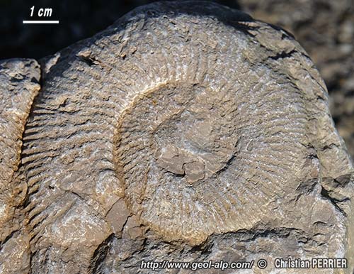 Ammonite du groupe des Perisphinctes : bloc éboulé de calcaires du Tithonique, tombé des pentes de La Fitolle et récolté dans le lit du ruisseau de Saint-Bruno, en contrebas du Monastère de la Grande-Chartreuse (cliché original obligeamment communiqué par M. Chr. PERRIER).
