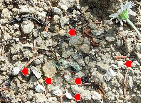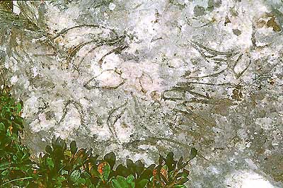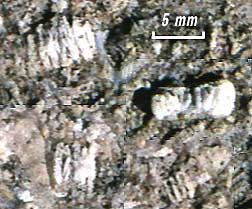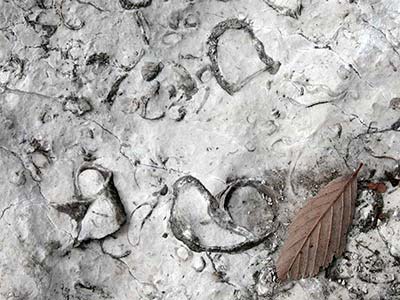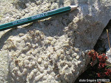 La "Lumachelle" est souvent riche en Encrines, soit isolées, à plat, sous l'aspect d'étoiles de 0,5 cm de diamètre, soit en piles de plusieurs, sous l'aspect de petites tiges segmentées tous les millimètres (fig.). Il est illusoire de chercher à les dégager car c'est la dissolution différentielle par les eaux météoriques qui les rend le plus visible en les dégageant en saillie sur les plaques de roche.
