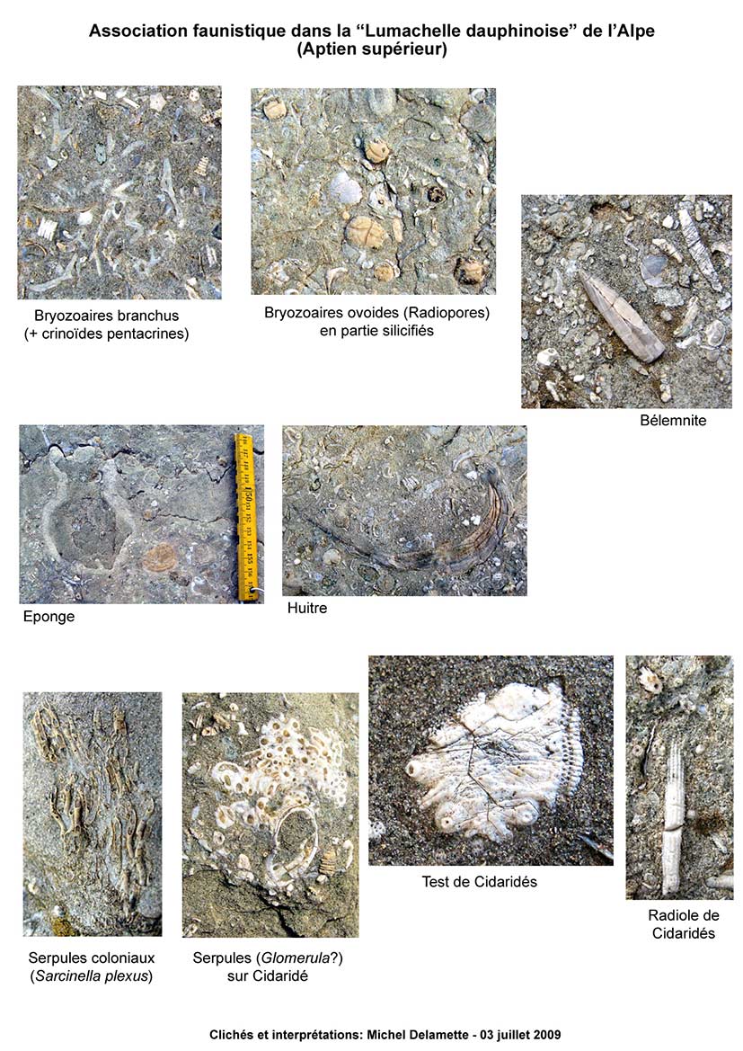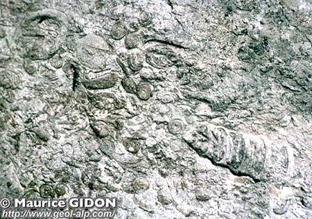 Les calcaires urgoniens, bien que souvent riches en coquilles de Rudistes (fig.) ne permettent que rarement de les voir autrement qu'en section. On ne peut guère en obtenir de dégagées qu'à la faveur d'entailles faites à la mine car il est difficile de réussir le dégagement au marteau d'une coquille engagée dans la roche. Il en est de même pour les niveaux à huîtres des calcaires du Fontanil, visibles par exemple (en aval du pont Saint-Bruno) dans les gorges du Guiers Mort.