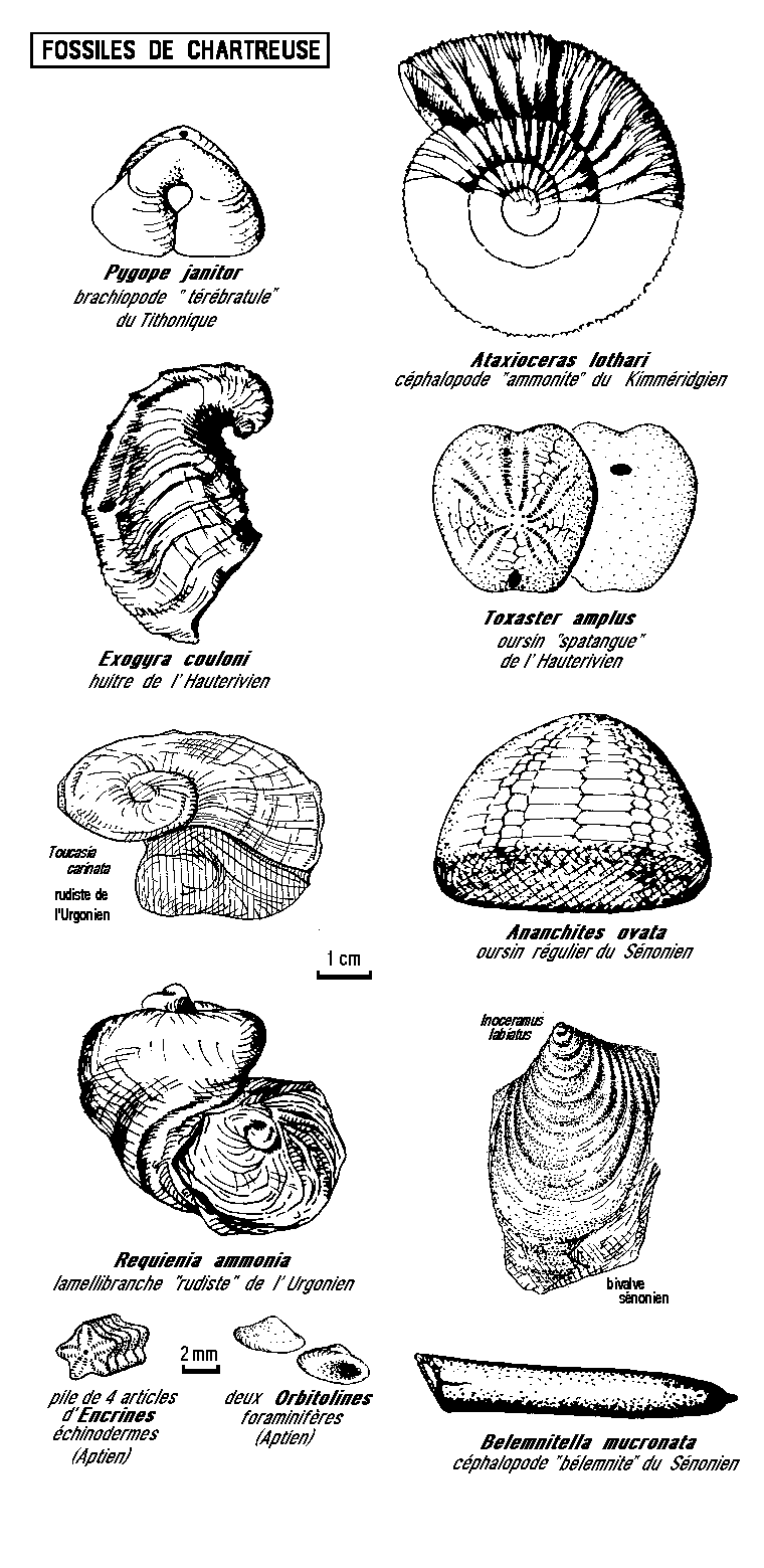 C'est en premier lieu le cas des "marnes à miches" de l'Hauterivien, riches en oursins irréguliers de la famille des "spatangues" (genre Toxaster) (fig.), qui sont naturellement dégagés par le gel et se récoltent au pied des talus où ces marnes sont mises à nu. Ces marnes contiennent aussi, en moins grand nombre, des huîtres du genre Exogyra (fig.). Les gisements les plus accessibles sont, dans la vallée du Guiers Vif, les entailles de route du Grand Frou et du Petit Frou (du côté aval des encorbellements) et, dans celle du Guiers Mort, celui situé à mi-distance du Pont Saint-Bruno et du Pic de l'Oeillette (en aval de la grande carrière qui a dégagé le pied de falaise).