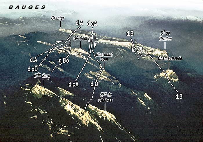 - Des failles d'extension, longitudinales, comme celle du Grand Poyat (versant ouest du Charmant Som) et celle du col du Mollard (versant est de l'Outheran) ; peut-être s'agit-il de la même cassure. Plusieurs observations, tant aux abords du col du Mollard qu'à l'extrémité septentrionale du chaînon du Corbeley prouvent que le fonctionnement de cette dernière faille s'est produit à l'Oligocène.
