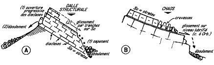 Modalités et origine des divers types d'éboulements A = Éboulements ordinaires : du côté gauche, basculement ou tassement de tranches verticales découpées selon les diaclases. Du côté droit, formation de dalles structurales par glissement d'un paquet de bancs sur un "niveau de décollement" des strates (le phénomène se répète en gagnant de plus en plus vers l'amont.