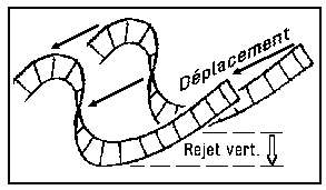 Si la ligne repère décalée correspond à une surface horizontale l'existence d'un rejet vertical implique évidemment un mouvement vertical de la surface considérée. Mais si les couches affectées par la cassure ne sont pas horizontales un rejet vertical n'indique pas que le mouvement l'était aussi. Il peut alors aussi bien résulter d'un coulissement horizontal, c'est à dire avoir été induit par une faille de décrochement. C'est là un cas représenté à plusieurs exemplaires en Chartreuse : un exemple tout-à-fait représentatif est donné par le cliché ci-après :