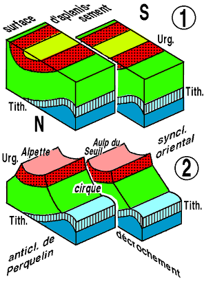 Dans ces deux exemples, comme dans celui (moins remarquable) des accès au col de l'Alpe, la cassure qui détermine le passage est une faille de coulissement qui traverse un synclinal perché. Cette circonstance semble donc particulièrement favorable. Il est vraisemblable que cela soit lié à l'intervention d'une étape préliminaire d'érosion par aplanissement (croquis suivant). Cette histoire semble d'ailleurs expliquer également la formation, lors de l'érosion "normale" ultérieure, des ébauches de cirques qui se sont ouvertes dans ces trois secteurs.