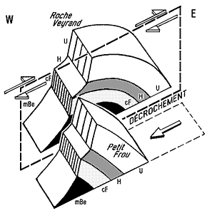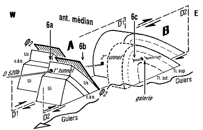 Une telle disposition s'observe notamment au débouché amont du second tunnel de la route du Guiers Mort (point 6c du schéma perspectif ci-après), où le flanc oriental de l'anticlinal médian (en amont du pont) est reporté vers l'ouest par un décrochement et se trouve plaqué ainsi contre le flanc ouest du même pli (compartiment en aval du pont, dans lequel est creusé le 2° tunnel).