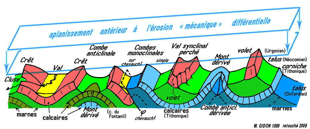 En effet, en divers endroits, notamment en Chartreuse occidentale (aux Rochers de Chalves, à la forêt de Génieux et aux rochers d'Arpison, cf. ci-dessous), la dissection actuelle du relief (en crêtes et ravins) laisse subsister des panneaux de quelques kilomètres carrés où la surface d'érosion, qui tronque pourtant les couches plissées, est pratiquement plane (quoiqu'à faible pente vers l'est). Ils se reconnaissent à ce que, au lieu de former des crêts* francs et aigus, dont le revers est formé de dalles structurales, les barres calcaires y sont coupées, à leur partie la plus élevée, par un chanfrein oblique aux strates.