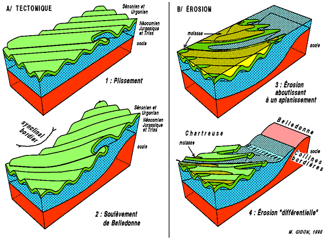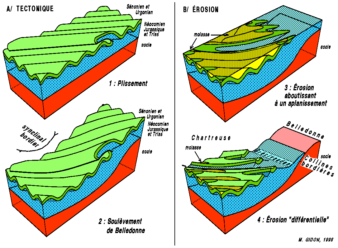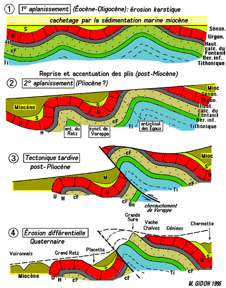Il est apparu que, pour bien comprendre divers aspects du relief chartreux et notamment le phénomène d'"inversion" du relief, il fallait tenir compte d'un épisode ancien où l'érosion a occasionné un aplanissement de la région, en tronquant par le haut toutes les structures tectoniques déjà formées (voir la note n°168 de la liste de publications)