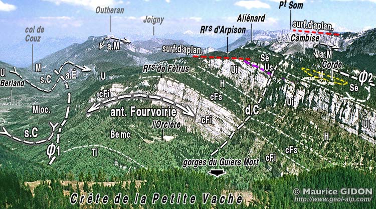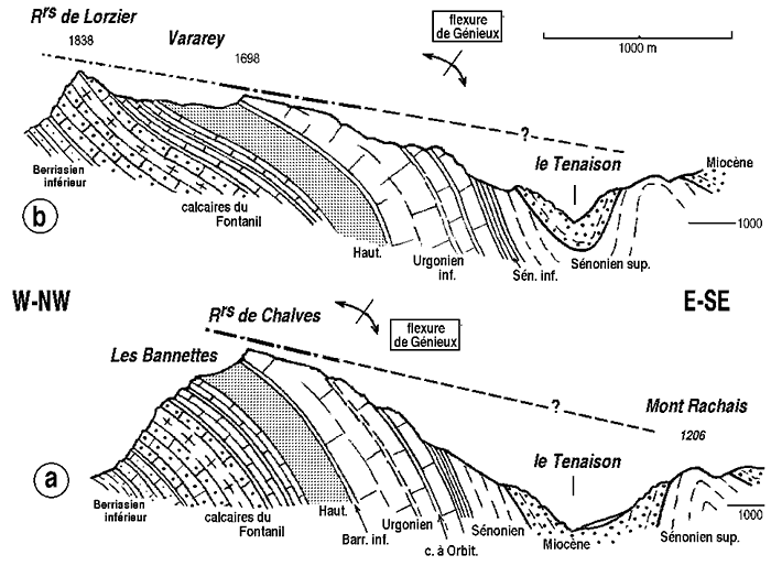 la marge ouest de la Chartreuse - La coupe 1 montre que de nombreux anticlinaux jurassiens (notamment celui du Ratz) ont été formés avant la première érosion continentale, qui à précédé la transgression miocène, car cette dernière les a plus ou moins profondément crétés ; |