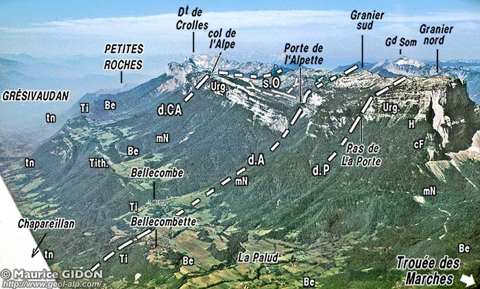 Au sud de Chapareillan cette barre tithonique est tranchée par le décrochement de l'Alpette entre Bellecombe au sud et Bellecombette au nord, mais cela ne lui occasionne qu'un décalage modeste (quoique bien perceptible) avant que son tracé se perde sous la plaine alluviale au hameau de l'Étraz.