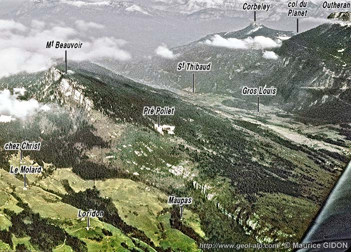 Cette aggravation du décapage de l'anticlinal par l'érosion est due avant tout au fait que l'axe anticlinal et sa voûte s'élèvent progressivement, du nord vers le sud : de ce fait l'altitude de la voûte des calcaires du Fontanil à la Cochette est presque la même que celle de la base de l'Urgonien à la pointe sud de l'Outheran. Il est à présumer que la faiblesse de la différence d'altitude entre ces deux éminences est due au fait que c'est peu au dessus de leur altitude que la surface d'aplanissement du quaternaire ancien a coupé presque horizontalement la voûte du pli (provoquant ainsi son éventrement ultérieur, à l'occasion des érosions plus récentes). |
