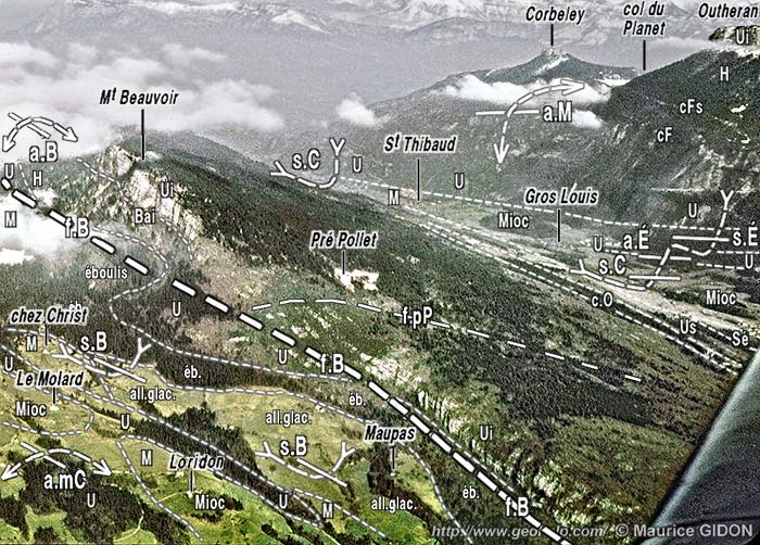 Tous ces faits indiquent que ces plis des confins de la Chartreuse et du Jura ont commencé à se former très tôt après le Sénonien (qu'ils affectent), puis ont subi une première érosion dès le Tertiaire inférieur. On peut même préciser qu'ils avaient, à cette époque, un plongement axial vers le sud, puisque la profondeur de l'écrêtement de leurs anticlinaux s'accroît vers le nord. On constate également que si la molasse miocène est elle-même affectée par le plissement c'est seulement parce que ces plis pré-existants ont été repris et accentués par les serrages post-miocènes. |