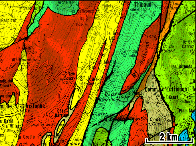 Au sud de Saint-Jean-de Couz le relief de la vallée s'ouvre assez sensiblement et sa structure voit s'amplifier les complications de son versant oriental (voir la page "Ègaux"). En même temps le tracé de la N.6 s'échappe de la vallée de Couz en traversant le flanc ouest du synclinal de Couz, c'est-à-dire le flanc oriental de l'anticlinal du Mont du Chat (voir la page "Mont Grelle").