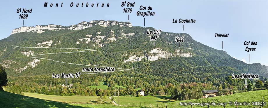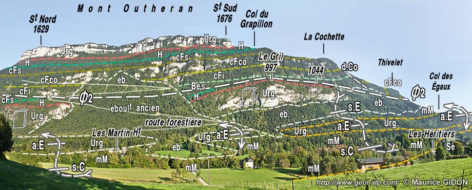 Dans le même temps on constate, plus haut dans le versant qui s'élève vers la crête de l'Outheran, que les couches de calcaires du Fontanil du cœur de l'anticlinal médian sont rompues par une faille inverse qui les fait chevaucher sur les dalles verticales de l'Urgonien du pied de versant : en fait il s'agit là de la naissance septentrionale du chevauchement de la Chartreuse médiane qui lui aussi affecte longuement l'anticlinal médian plus au sud.