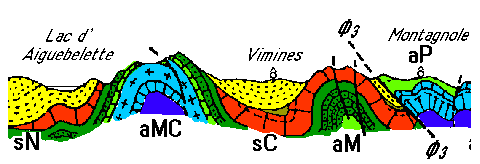 ![]() Coupe de la partie médiane du synclinal de Couz s.N = synclinal de Novalaise ; fE = faille de L'Épine ; a.MC = anticlinal de L'Épine - Mont du Chat ; s.C = synclinal de Couz ; a.C = anticlinal du Couvent (= anticlinal de la Chartreuse médiane) |