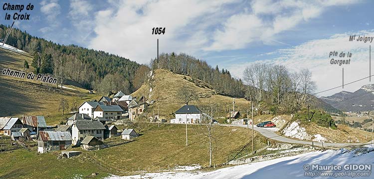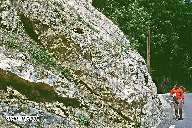La route qui mène au village traverse aussi cette lame rocheuse en dessinant, avant d'y parvenir, un tournant fortement saillant vers le sud (point coté 996). On peut constater du côté ouest, au niveau du parking (partie droite du cliché), que son Urgonien, bien que fortement broyé est presque en contact stratigraphique avec le Sénonien inférieur du vallon. |