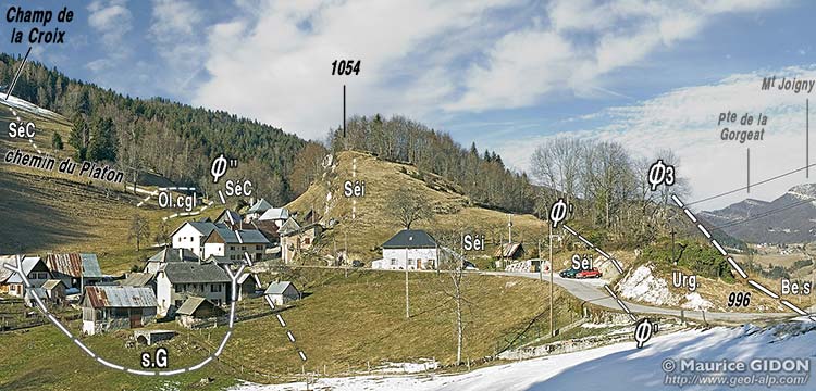 C'est enfin à l'extrémité aval de ces affleurements, aux abords de "Chez Joubert", que se produit, dans le lit du Cozon, l'intersection de ce chevauchement par l'autre accident majeur du secteur que représente le décrochement de l'Alpette. Cet entrecroisement aboutit à un dispositif structural qui est assez complexe dans le détail car le décrochement s'y partage en plusieurs branches secondaires et parce que des copeaux de la lame urgonienne qui jalonne le chevauchement sont entraînés vers l'ouest le long de la branche septentrionale du décrochement (voir la carte ci-dessous).