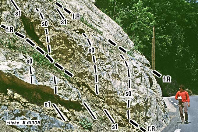La route atteint effectivement le tracé de la cassure principale du chevauchement (Ø3 sur les schémas), très peu en aval, entre 200 et 250 m de distance du Pont du Lac : il y est jalonné par une lame d'Urgonien broyé qui n'est épaisse que de moins de 10 m.