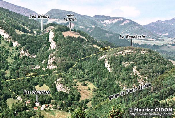 Au sud de la bosse 1019 la lame urgonienne des Gandy s'épaissit et forme un abrupt dominant le ravin boisé qui descend vers Les Courriers. Son examen montre qu'elle est surtout formée d'Urgonien supérieur car elle est garnie du côté ouest par des placages sub-verticaux de Lumachelle et de Sénonien inférieur (observables à son extrémité inférieure). On voit aussi qu'elle est sectionnée transversalement par plusieurs cassures à pendage modéré vers l'est qui la débitent dans le sens de son étirement en tronçons ("faille de Riedel*). |