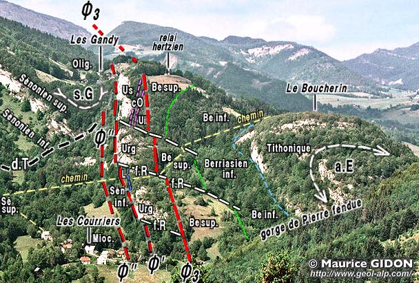 ![]() Le site des Courriers et les gorges du Cozon vu du sud, depuis le collet du Mollard de la Croix (à l'est de Saint-Pierre-d'Entremont). DT = décrochement de la Tournette, qui décale vers la gauche - donc dans le sens dextre - la limite entre Sénonien supérieur et inférieur : les ondulations de son contour ne sont pas des plis mais des V topographiques* dus à son pendage sub-vertical. Ø3 = chevauchement de la Chartreuse orientale ; s.G = synclinal des Gandy (rompu par le chevauchement) ; a.E = anticlinal de l'Écoutoux ; s.S = synclinal du Sappey ; a.P = anticlinal de Perquelin. Dans la partie gauche du cliché on a placé, à gauche du village, un signe de pendage qui indique que le Sénonien plonge sous la molasse miocène des Courriers. En arrière-plan se développent les reliefs mous de la dépression des Entremonts, où se développe toute la succession stratigraphique (et notamment les épaisses couches à prédominance marneuse du Berriasien) de la Chartreuse orientale. |