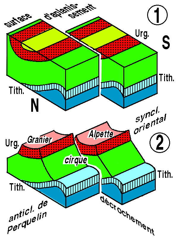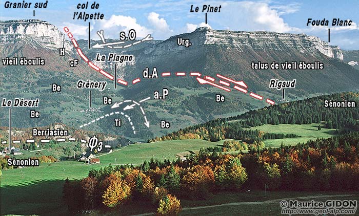 La formation de la dépression qui longe le pied de cette falaise ne se comprend en fait que si l'on tient compte de l'action d'une probable érosion ancienne qui avait arasé les voûtes anticlinales au dessus de l'altitude qu'atteignait alors la surface qui tangente actuellement les lignes de crêtes du massif (voir à ce sujet la page "aplanissement").